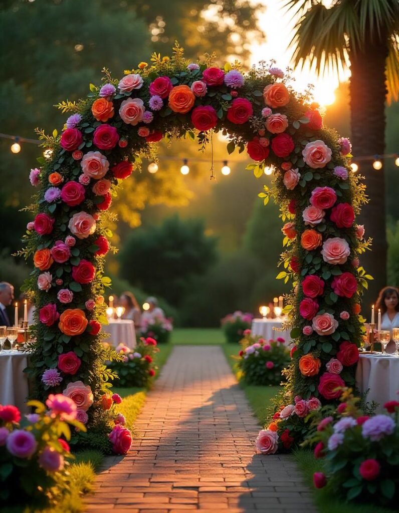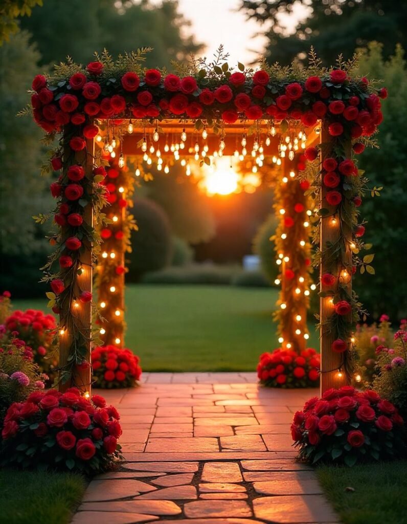 Imagine walking through a path sprinkled with rose petals, leading to a floral arch glowing with fairy lights. The air smells like fresh flowers, and everything around feels soft and magical. It’s the perfect setting for a romantic evening ceremony.