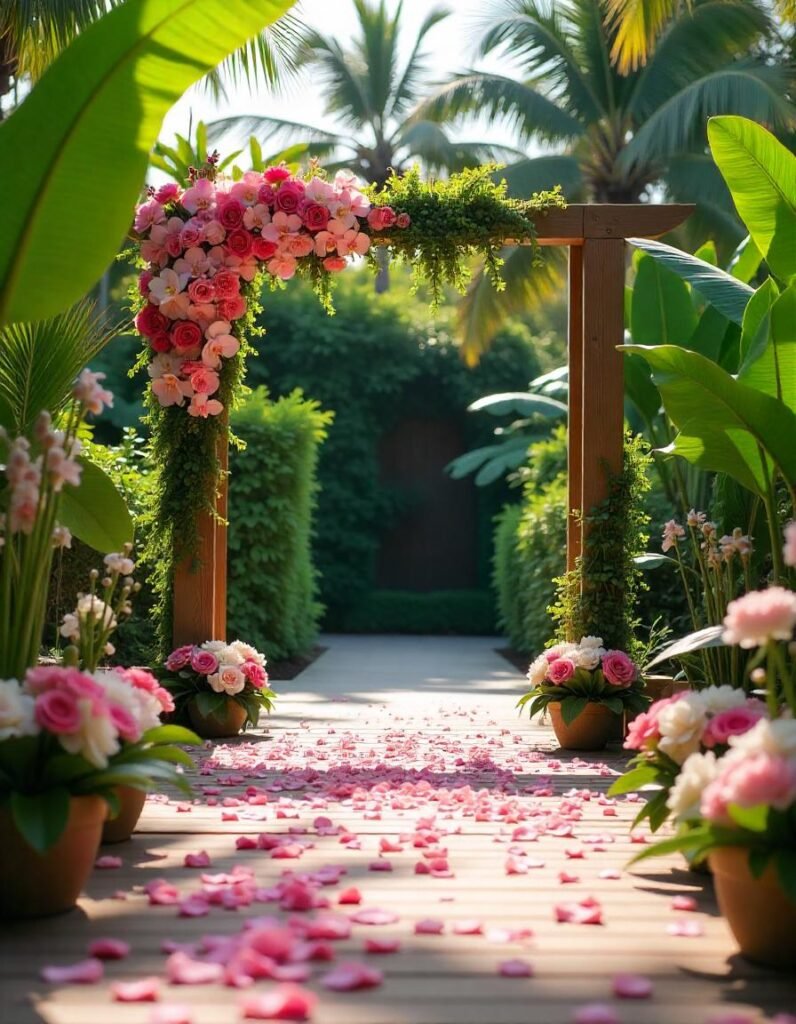 If you’re dreaming of a lush, tropical wedding, this one’s for you. A petal-strewn aisle, towering palm trees, and vibrant flowers create a serene paradise. It’s peaceful, colorful, and absolutely unforgettable.